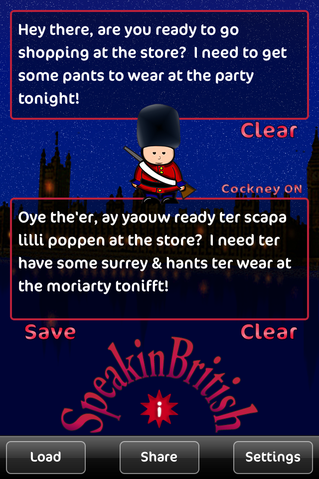 Ello chaps! Speakin British is a smashing app that adds a British accent and/or a little cockney slang to your messages. Indeed, it is easy to use, just type a message and translate it in the tap of a button. Your translations can then be shared in a moment's notice to all your friends! Chin wag with your blokes and send them cockney messages that are full of gobbledygook or impress your bird with a sexy, distinguished accent like James Bond ! So, the Best of British to you, Cheerio!