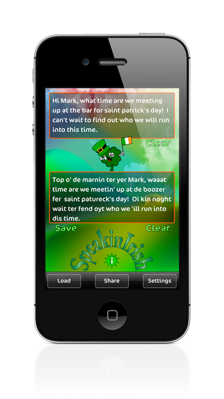 Top of the mornin to ya! This be Speakin Irish, a grand application that will have you soundin just like a lad or lass with an Irish accent. Type a message and translate it, then share your translation with all of your friends. Regardless of how many pints of Guinness you've had at the pub, this app is fun and easy to use.