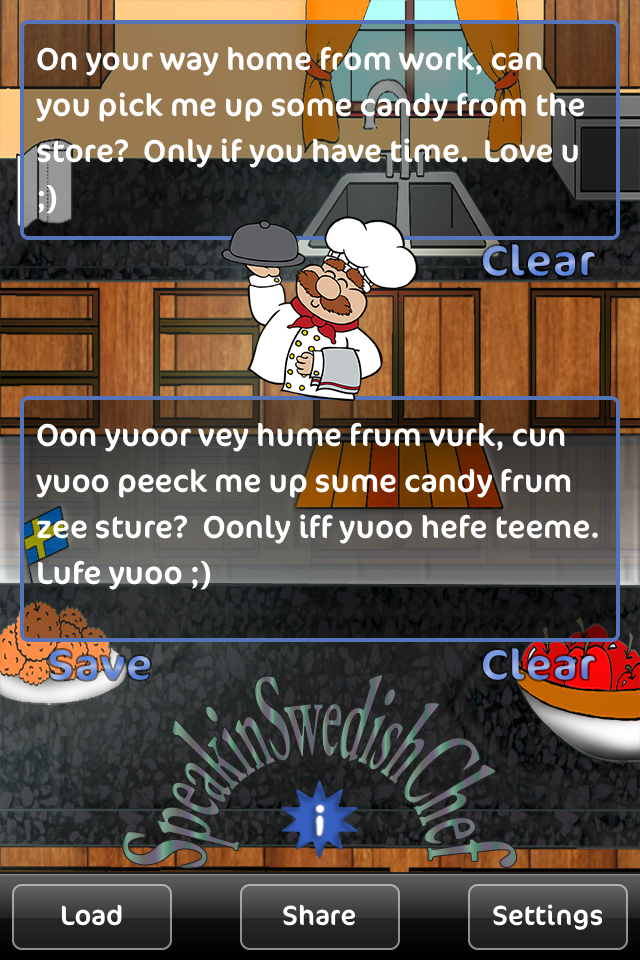 Hej! Velcume to Speakin Swedish Chef. Put a funny new twist on your conversations by translating all your messages to sound as if you have the chef's swedish accent. With this easy to use application you can type a message and translate it in the tap of a button, then message it to your friends.