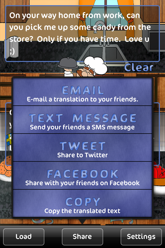 - Share your translations with your friends instantly through E-mail, SMS (text message), Facebook, or your own messaging application