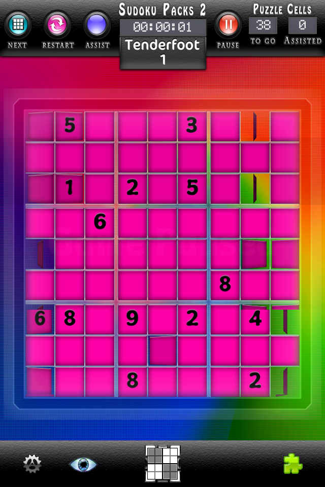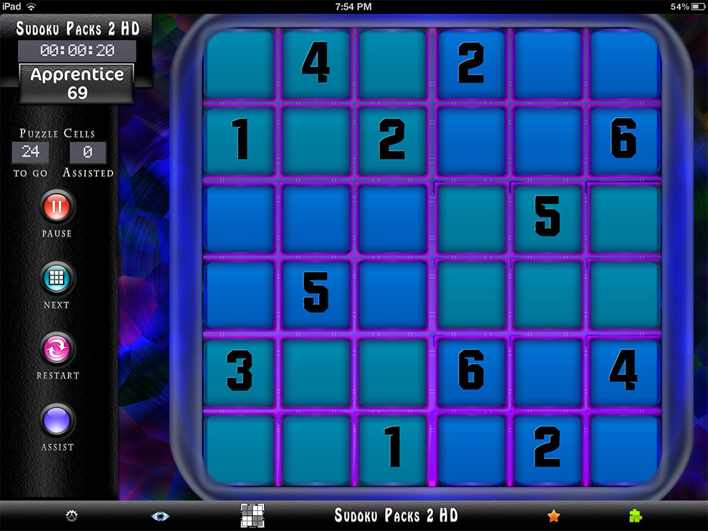 Sudoku Packs features numerous handpicked Sudoku puzzles expanding six progressive difficulty packs. Sudoku Packs is an exhilarating and challenging game for both novice and experienced players. You can play the classic 9 x 9 puzzle grids or venture your way through each puzzle pack. Defeat all the packs to win the game! If your Sudoku addiction cannot be tamed by the traditional book of puzzles, then take it to new heights with Sudoku Packs.